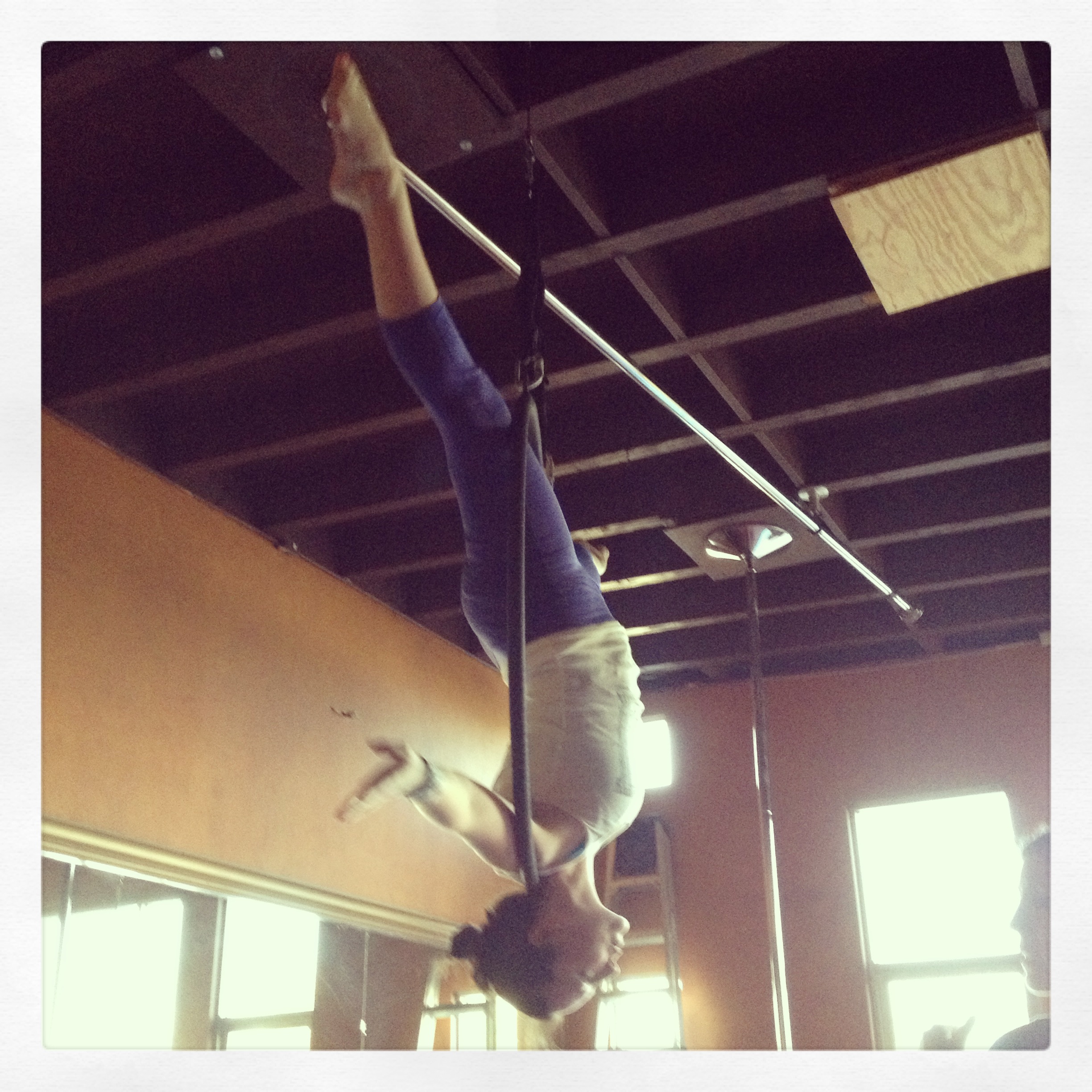In all of these photos, I have on my zebra striped Vertical Swag wrist wraps. I do think they’ve helped me stabilize my wrists, especially since I’ve been working to move into more aerial/twisted grip moves. TG is hard on my right wrist, which is my “pull” wrist (the hand that is “up” in all of my TG moves). After taking two weeks off from class because of the holidays and my busy work schedule, all it took was one class filled with twisted grip moves and handspring work for my wrist to be in a ton of pain – and, of course, I had neglected to take the time to put on my wrist wraps before that class, which was not smart – I think it would have helped a lot if I’d put them on! Since then, I’ve been keeping my wrist wrapped a good portion of the time that I am not in class (depends on the day and what I’m up to), and I went back to using my wrist wraps, even in Lyra, which is normally not that bad on my wrist. I think the wraps have helped with the pain!