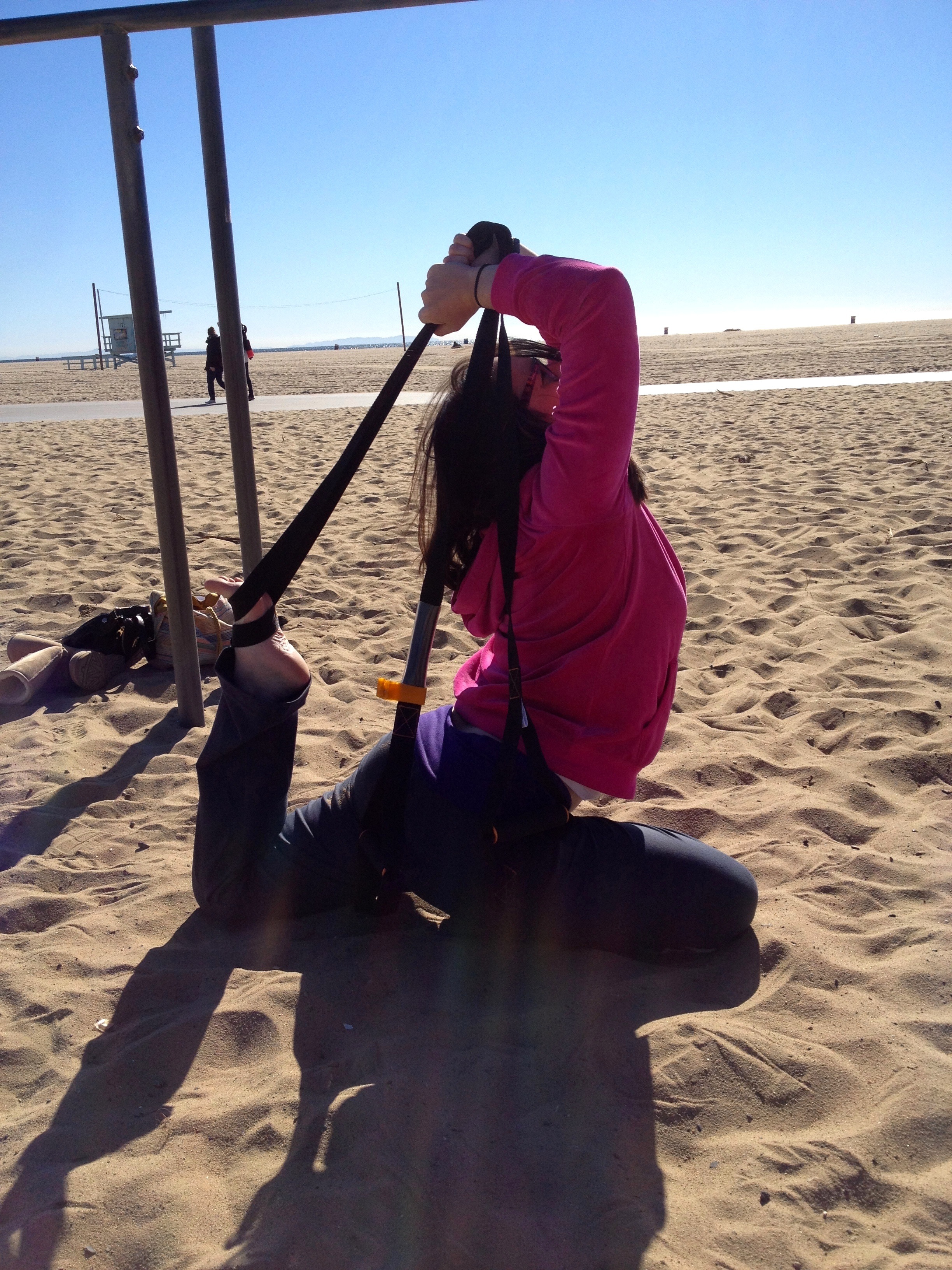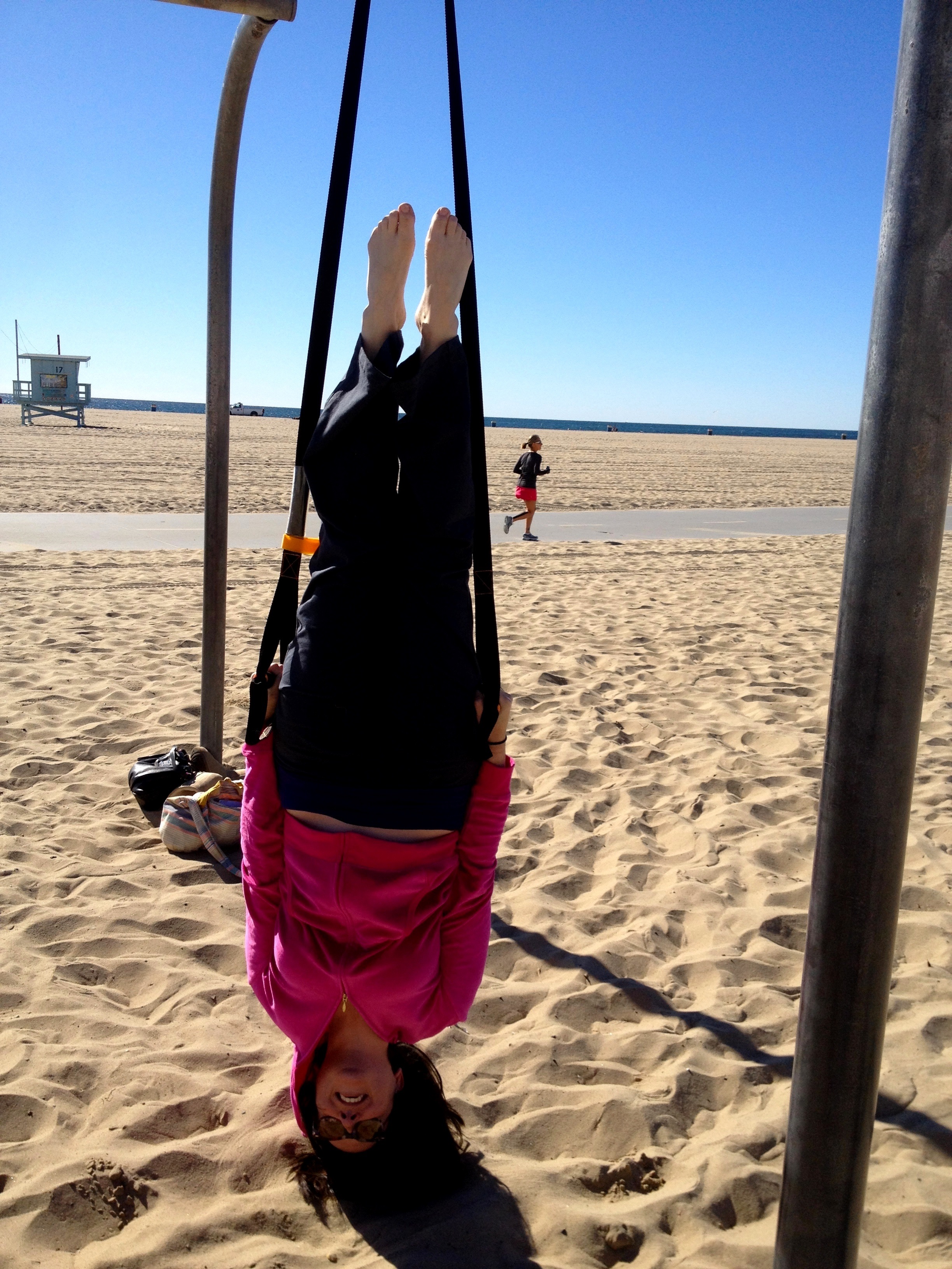 Since I also wanted to test it specifically for pole and aerial conditioning, I opted to take it outdoors and see what I could do. While you can use a sturdy tree branch as your anchor on which to wrap the strap, I wanted to get a little more height and variety, so I took it down to the aerial equipment playground by the Santa Monica Pier (living in Los Angeles does have perks!). I was able to toss one end of the strap over some of the mid-height bars, wrapping it a few times as necessary, and then play with inverting – I did move the plastic strap anchor off to one side of the strap, in order to get centered in the bars, as they’re fairly narrow. I found that it was pretty good for inverting into an upward pencil position, or a forward pike. I wasn’t quite able to do a straddle invert, as my hands are not big enough to safely grab both handles together, but the other basic inverts are great for working on your back and shoulder stability (and abs, naturally). Because of the nature of the strap, when you do invert, your weight pulls the strap into a taught position – however, you still have to work to stabilize it, therefore working your arms, shoulders, etc. For the inverts I am doing in the photos, we still had the strap fairly low compared to where you might place your hands for a pole invert (and very low compared to a hoop invert), but I was still able to balance into it – a taller bar or tree branch might be a better option for a truer sense of inverting, but I still had to work to remain stable.