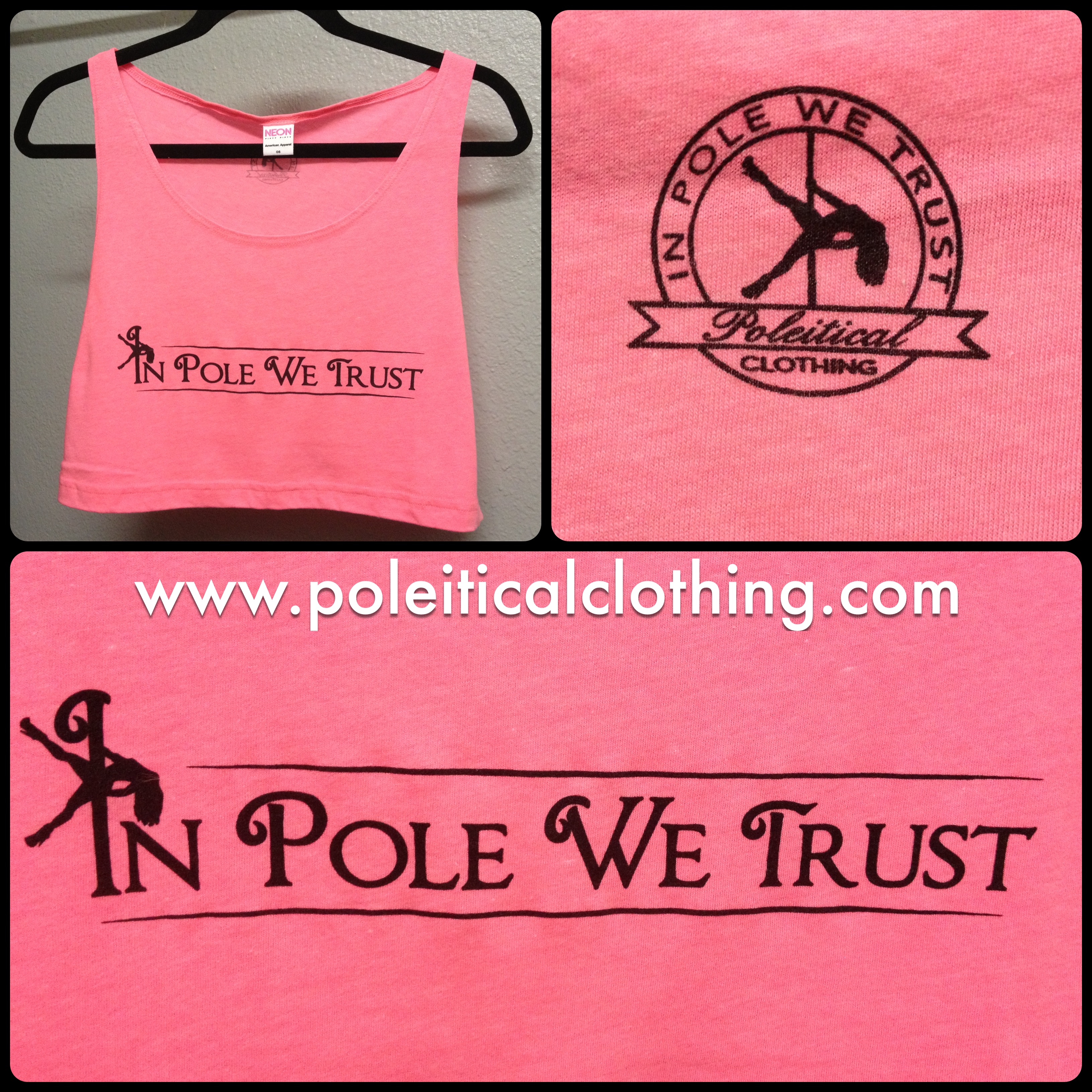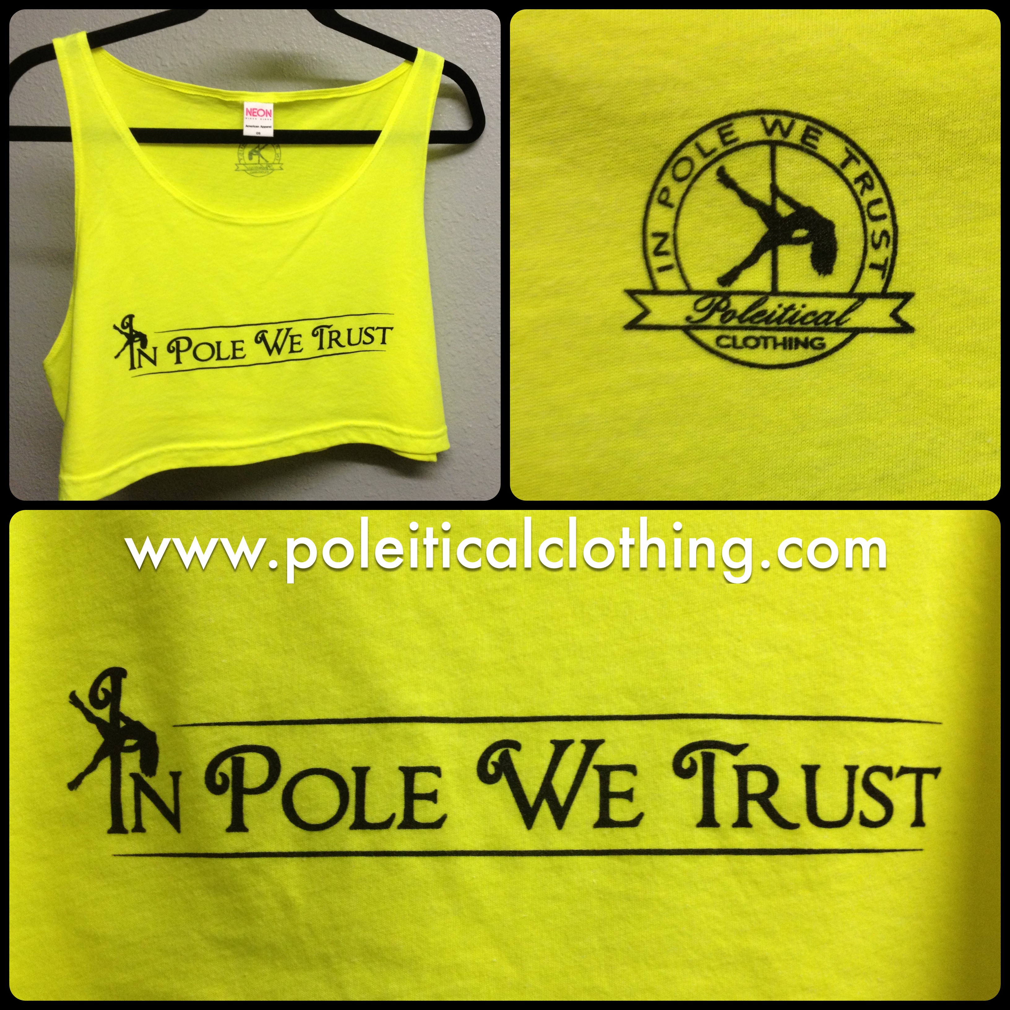 This super soft, super comfy tank comes in two amazing neon colors: screaming yellow and perfect pink! Cut for One Size Fits All, our In Pole We Trust tank is cropped under the bust and compliments a variety of body types. Our Poleitical Clothing logo is printing on the back, at the neck, and our new IN POLE WE TRUST artwork is splashed across the bust! This tank leaves your favorite grip points free and clear, allowing you to not have to sacrifice cute style for a solid move! Both tanks are priced at $20 USD each, with worldwide shipping available.